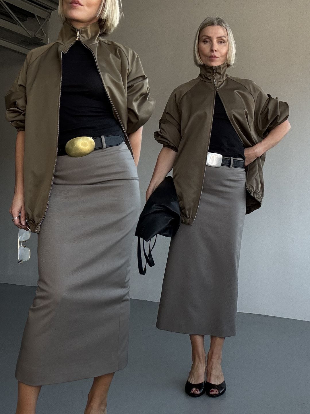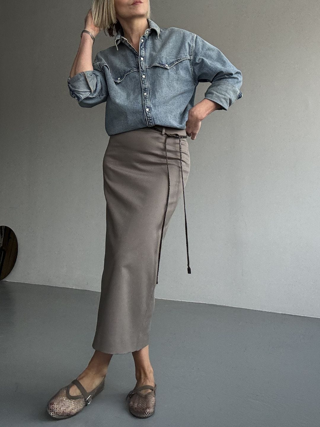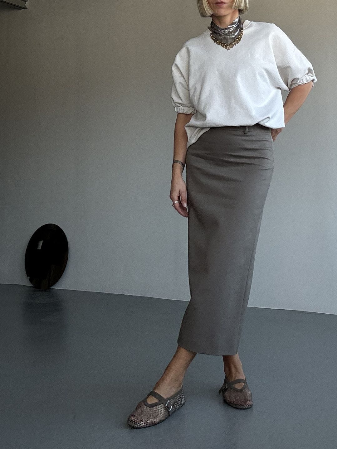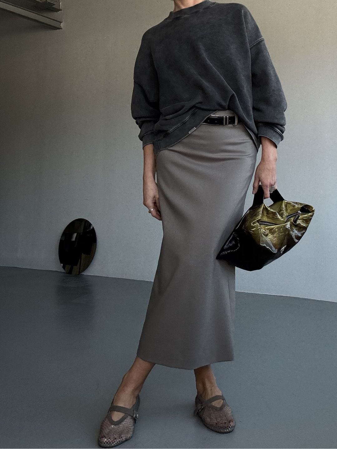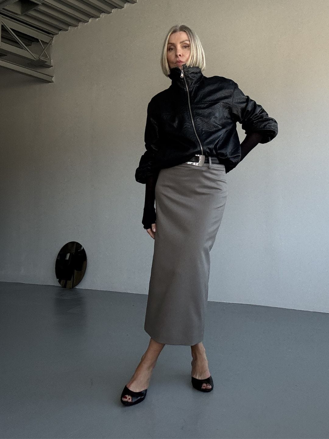A pencil skirt can turn “proper” fast. I interrupt that with something casual, a sweatshirt, a denim shirt, a bomber, a skater tee. Contrast is what keeps it modern.Shoe sets the mood