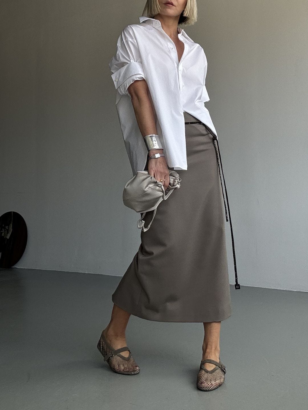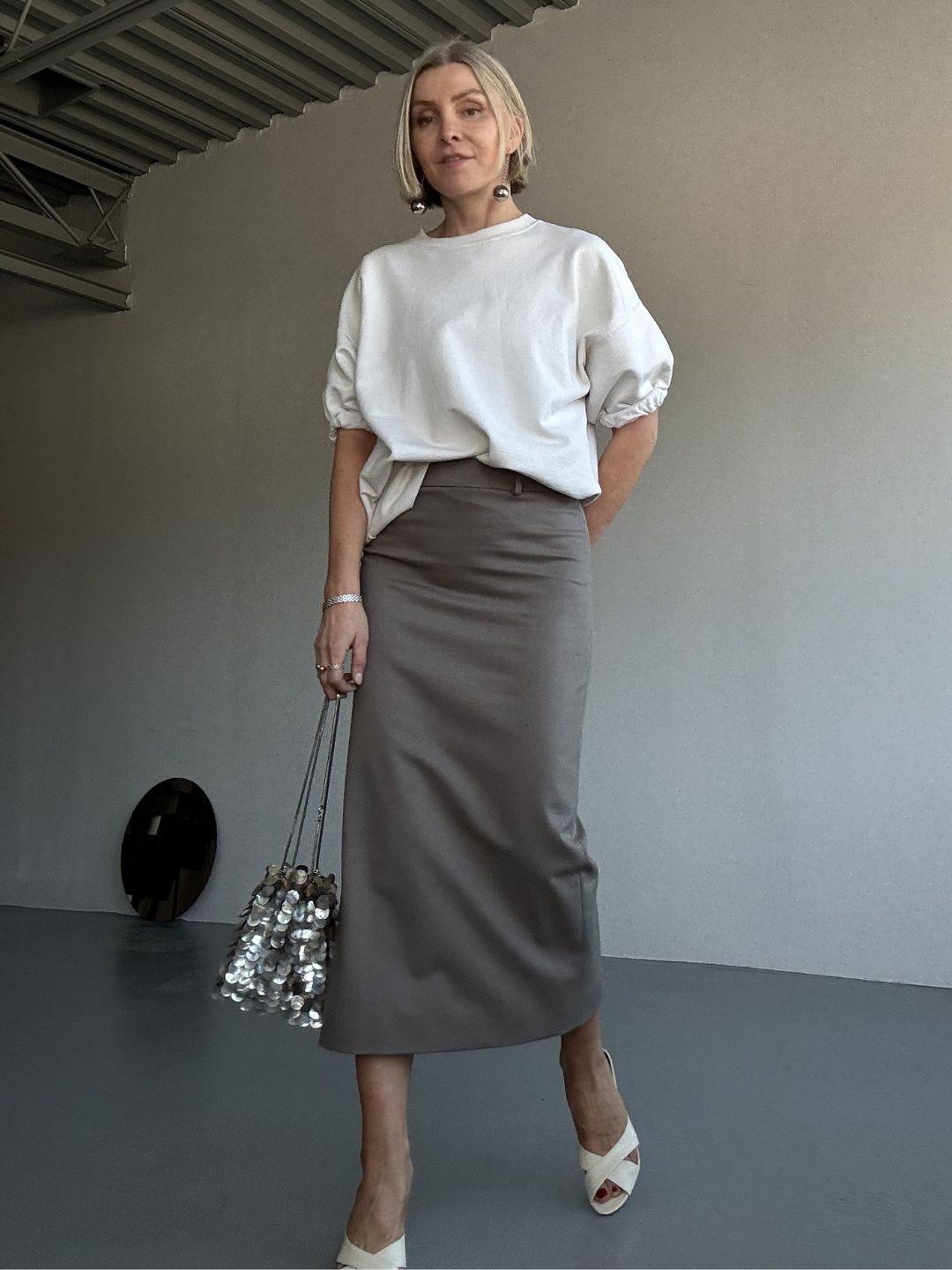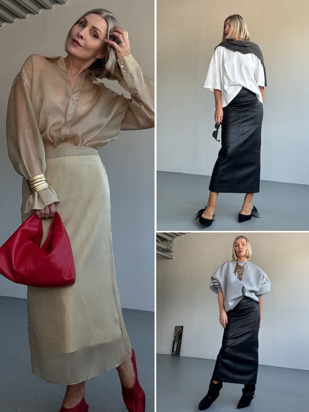 If you’ve been avoiding midi skirts, start with one that has structure and a clear hemline. Then treat it like a base piece, not an occasion. Let the shoe and the top layer do the shifting.