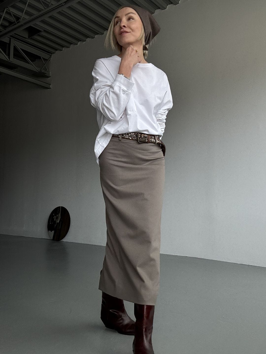 This is the sharper slot. A sleeker top, a more precise shoe, one detail that carries the look. Not “evening,” just more finished. The skirt stays the anchor, you’re only adjusting the level of formality.