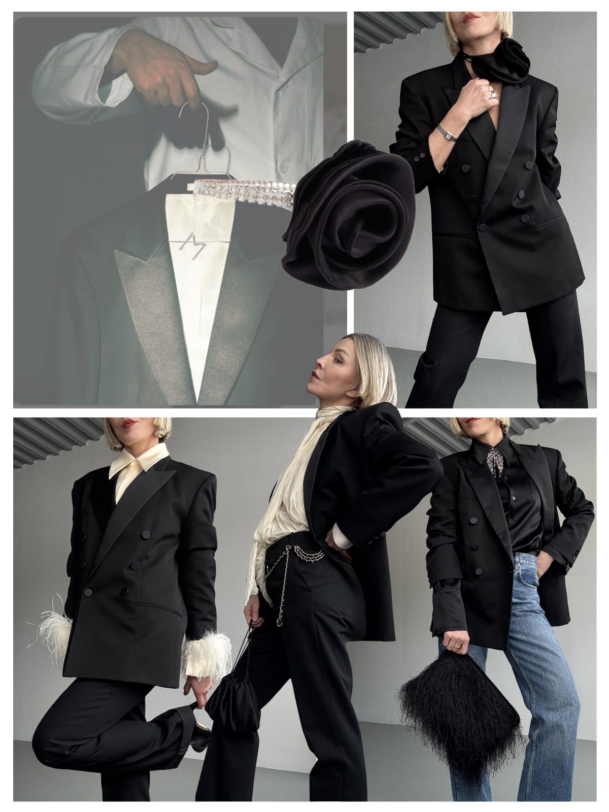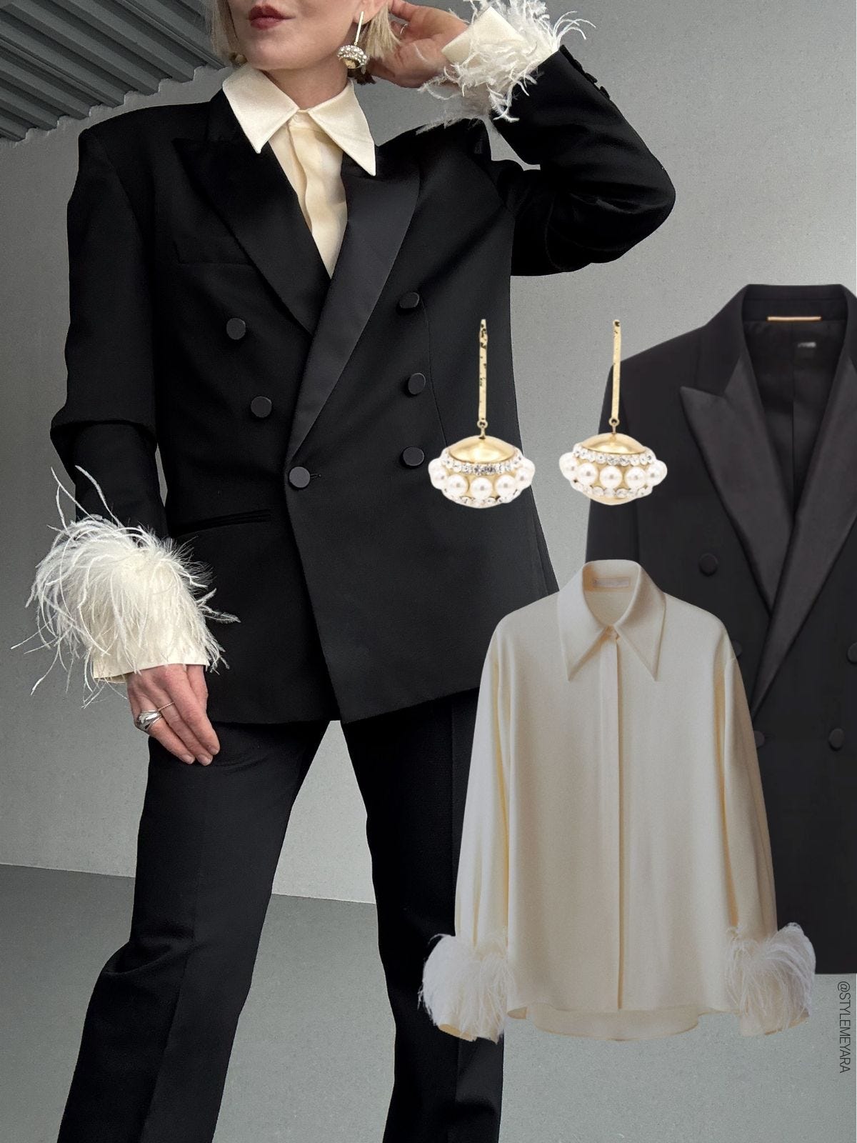 Evening looks built on clean black tailoring and one focal point. Strict base, single accent, maximum impact.