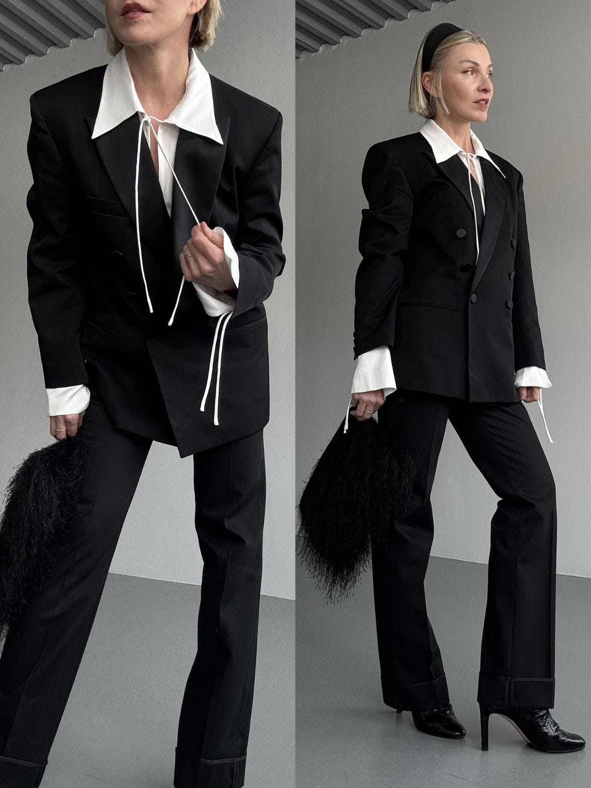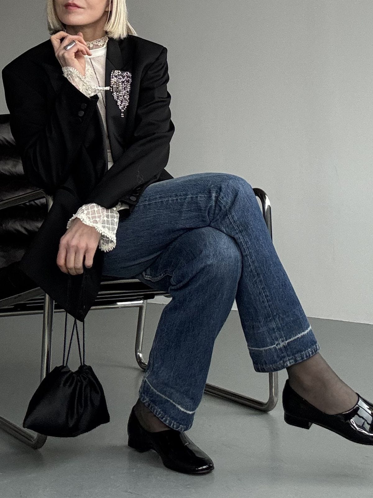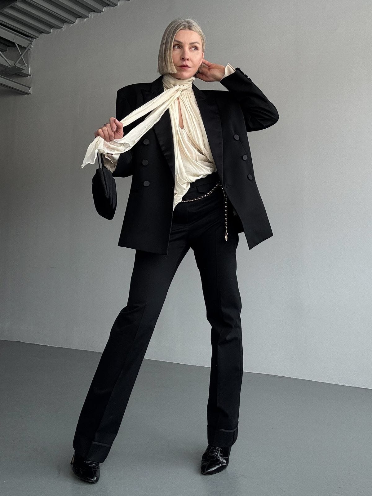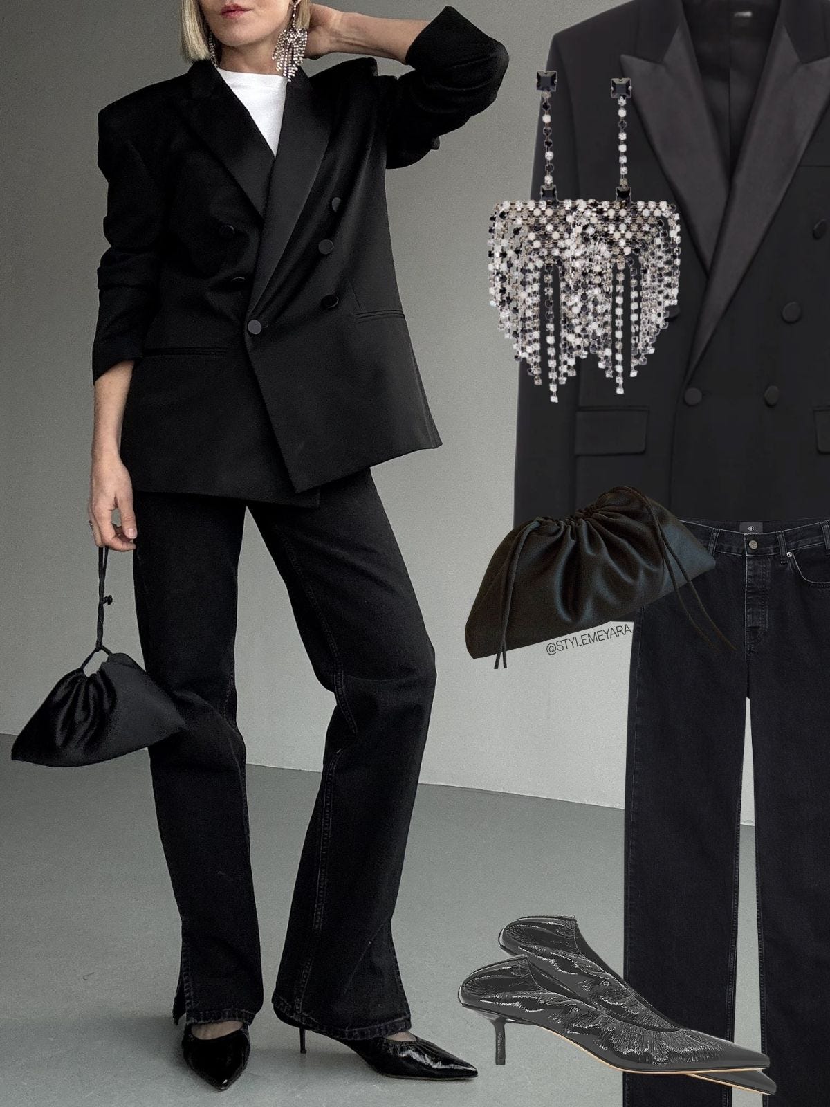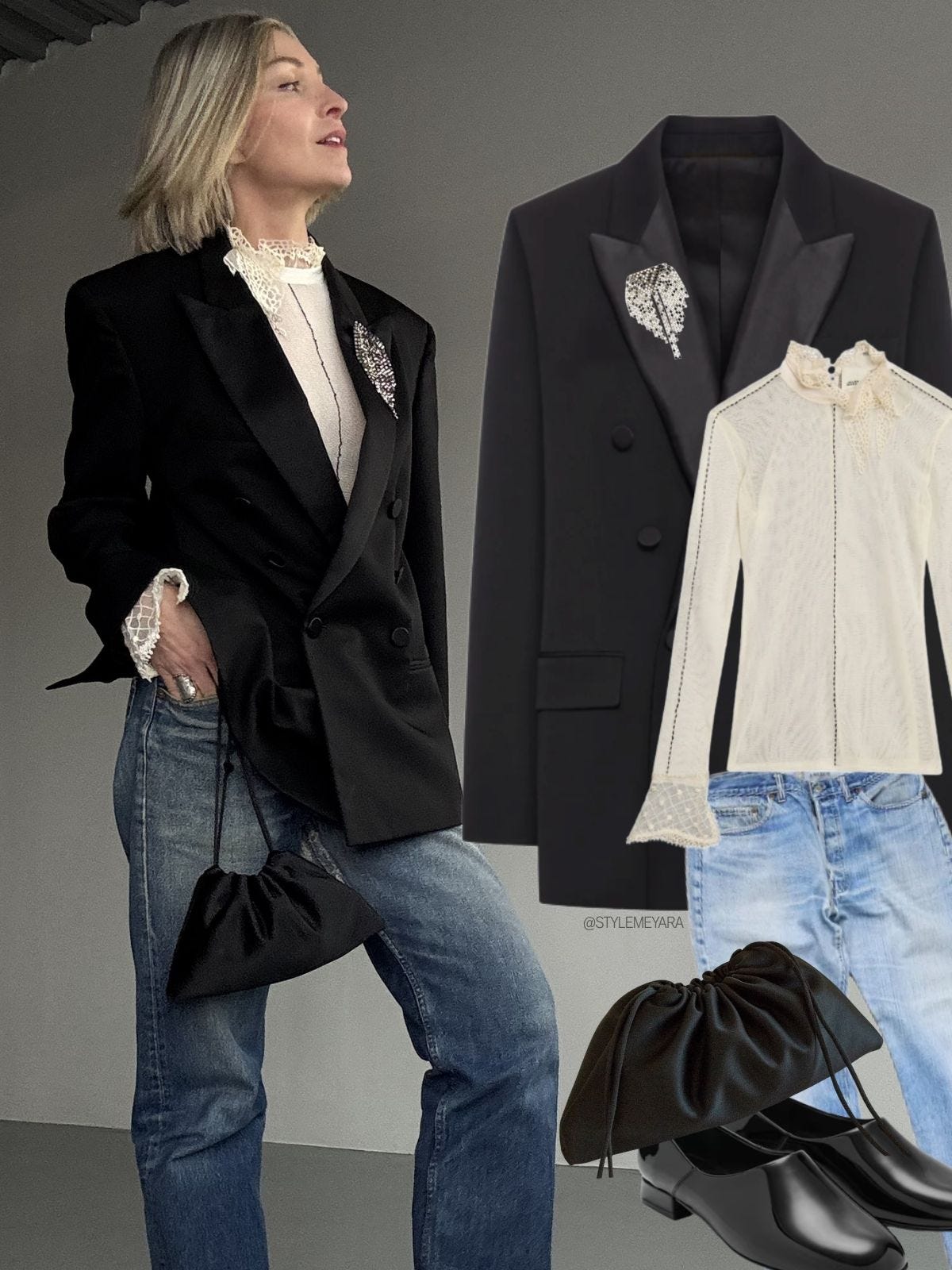 A tuxedo blazer isn’t just a blazer. It has a point of view. It reads sharper, more intentional, slightly more evening, and lets the rest of the outfit stay simple.